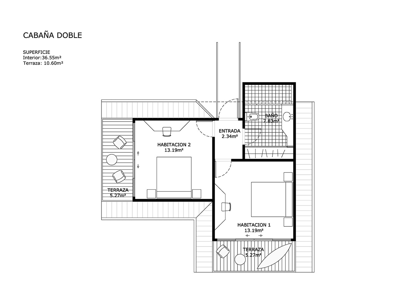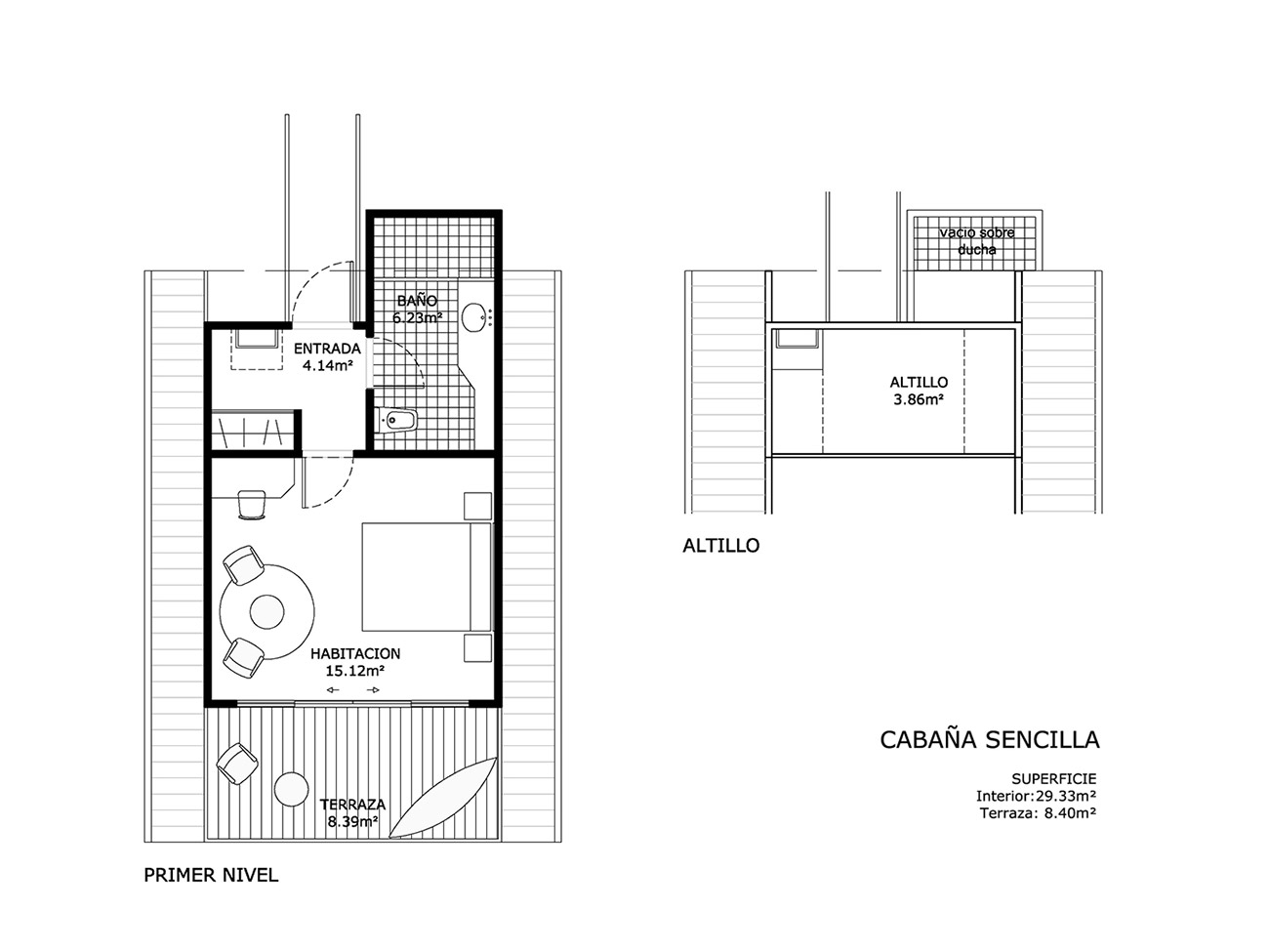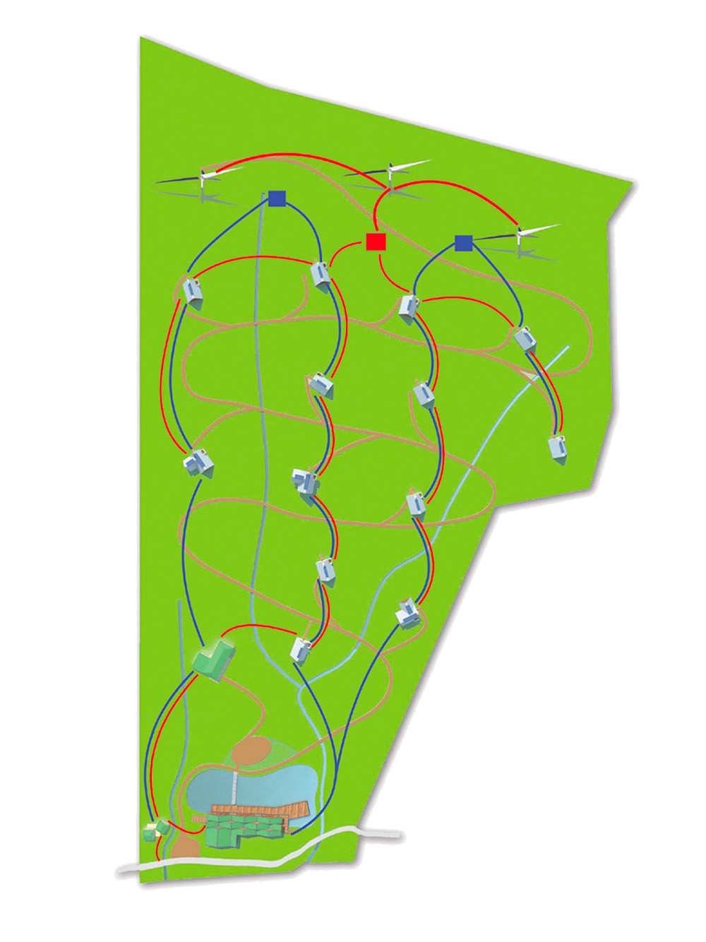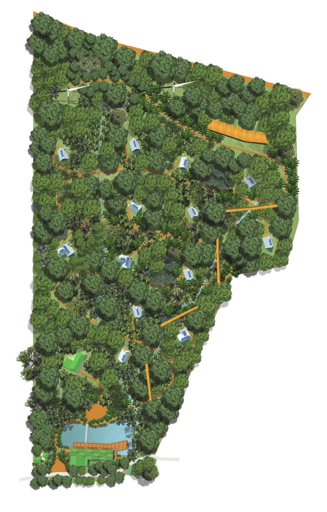 Le restaurant est situé sur la partie basse du terrain en lien avec le village pour faciliter l’accueil des visiteurs. Les cabanes sont distancées les unes des autres afin de privilégier l’intimité, un parcours ascendant amène les visiteurs vers une grande terrasse proposant une splendide vue panoramique.
