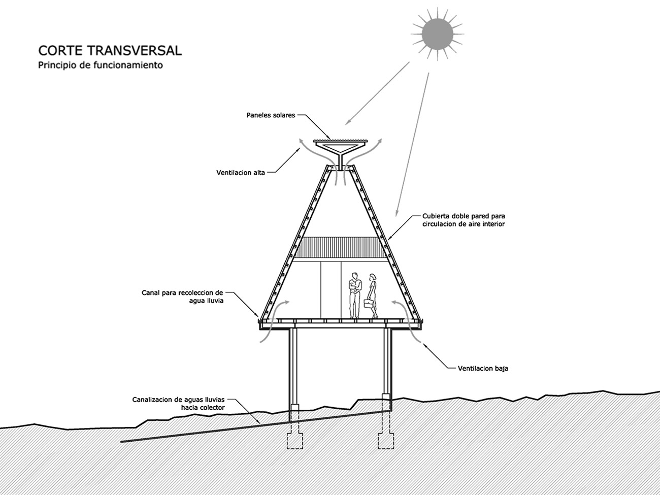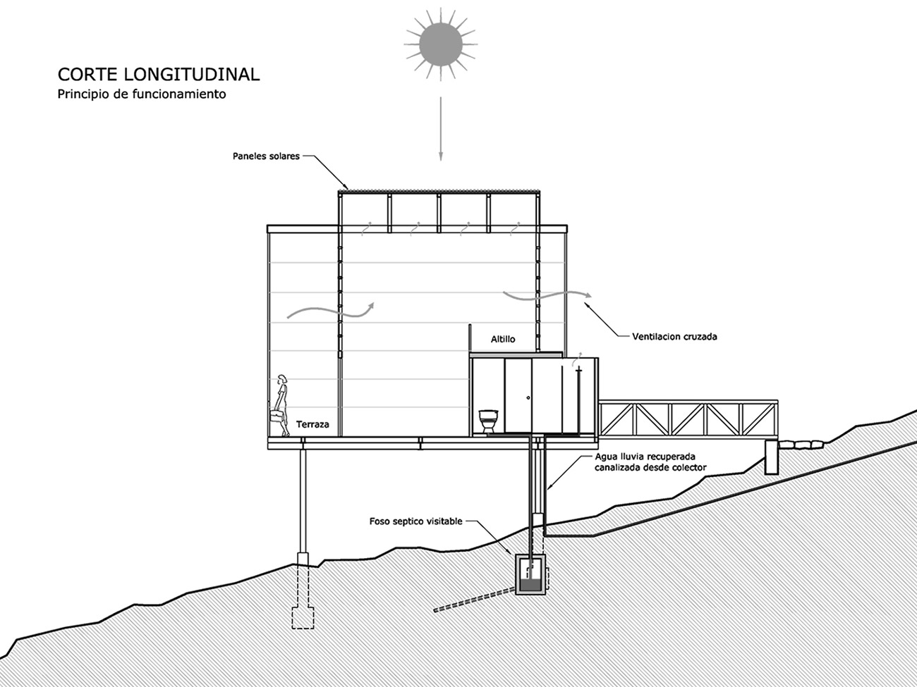 Toute la structure en bois des cabanes repose sur de piliers en métal galvanisé finement ancrés dans le sol. Un minimum de contact avec la terre favorise la circulation du vent sous le plancher et en même temps protège l’intérieur de l’intense humidité du site.