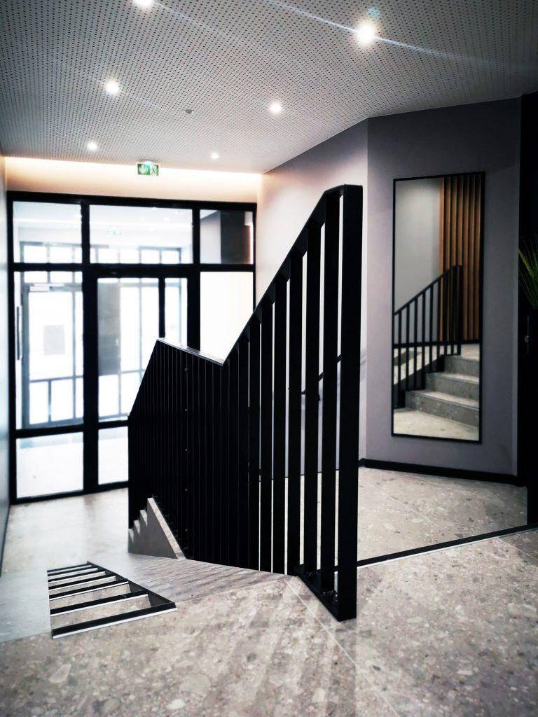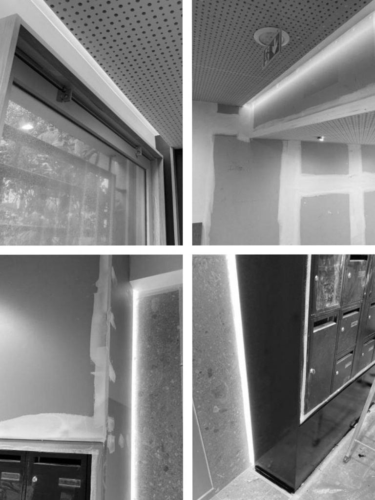 Rénovation complète du hall d’accès d’un immeuble de logements comprenant le remplacement des châssis vitrés sur rue.